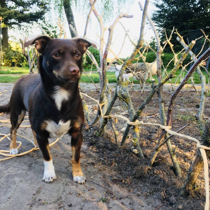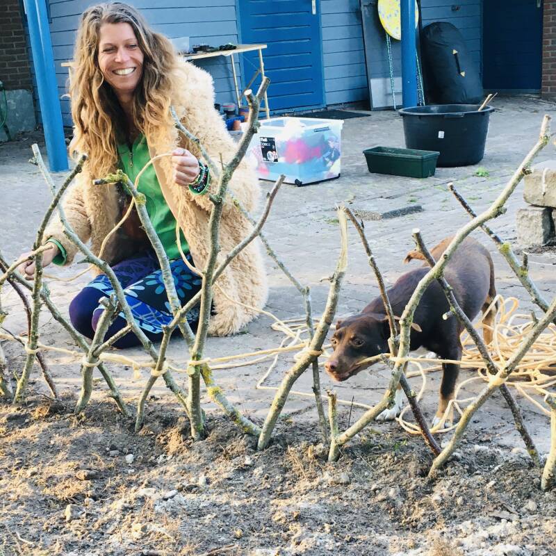 Hergebruik van materialen maakt het cirkeltje rond! Wat ik zo heerlijk vind aan een permacultuur leven is dat alles rond is. De kringloopgedachte ten voeten uit. Ver weg van alle rechtlijnigheid maak je in een permacultuur tuin zoveel mogelijk gebruik van aanwezig materiaal. En dus worden de takken die over zijn na een snoeibeurt een hekje om dieren en kinderen uit de bloementuin te houden. Door ze kruislings te plaatsen en vast te maken met touw ontstaat een stevige omheining. Het touw was over bij erfwinkel Landleven in Onstwedde, die ook graag circulair denkt. Mijn hondje had andere ideeen over mijn knooptechniek en hielp mee om mijn knopen weer netjes los te maken. Verschil van inzicht, dat is duidelijk.