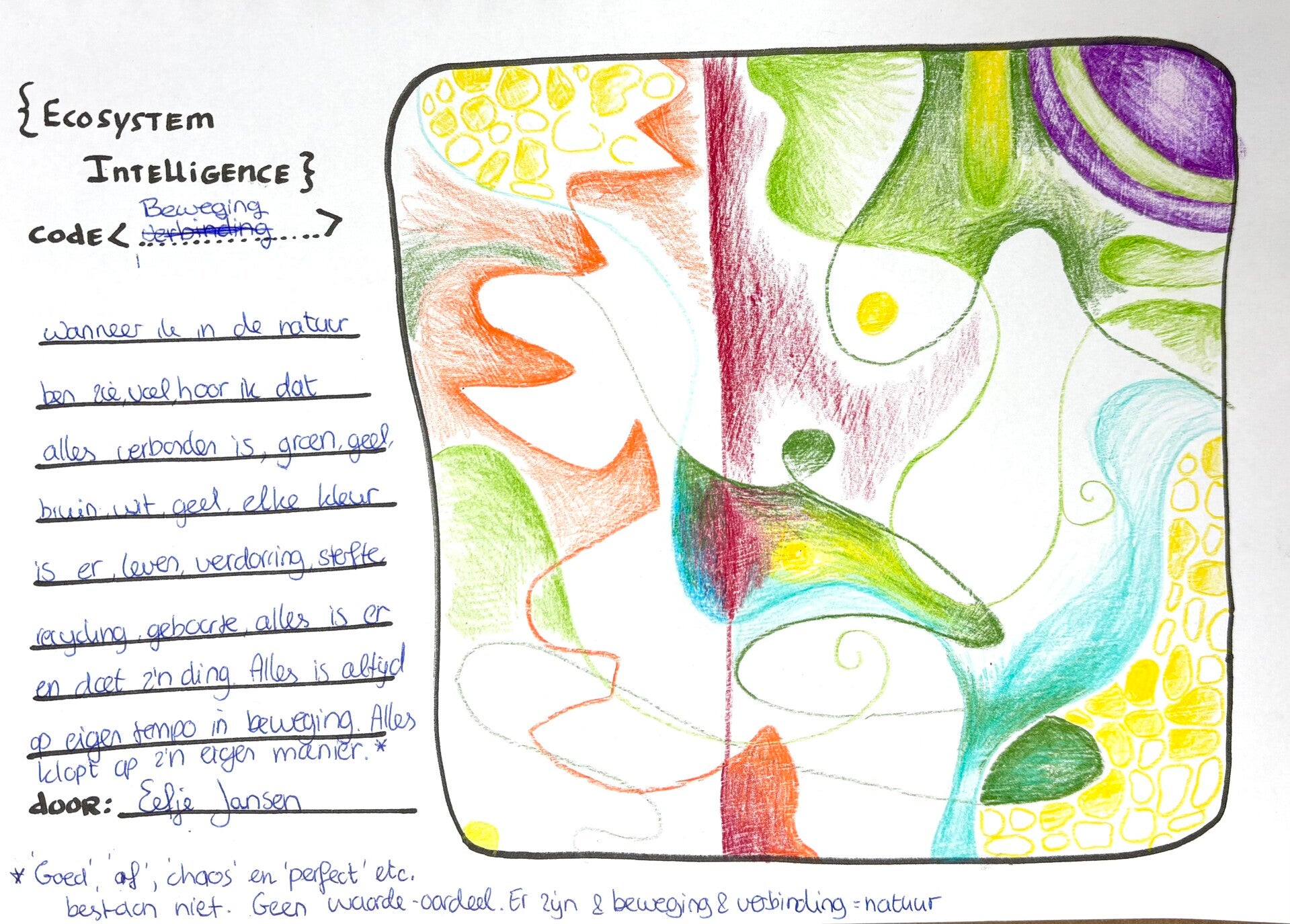 { ECOSYSTEM INTELLIGENCE } heeft een genialiteit die je pas kunt zien als je het op een dieper niveau bekijkt Wanneer je de codering ontdekt, voel je dat zich een geheim aan je openbaart. Iets wat nederig en respectvol maakt. Met dit kunstproject onderzoek ik hoe ik deze codering in beeld kan brengen via kunst. Want waarom staart iedereen zich blind op Artificial Intelligence en heeft bijna niemand oog voor Ecosystem Intelligence?