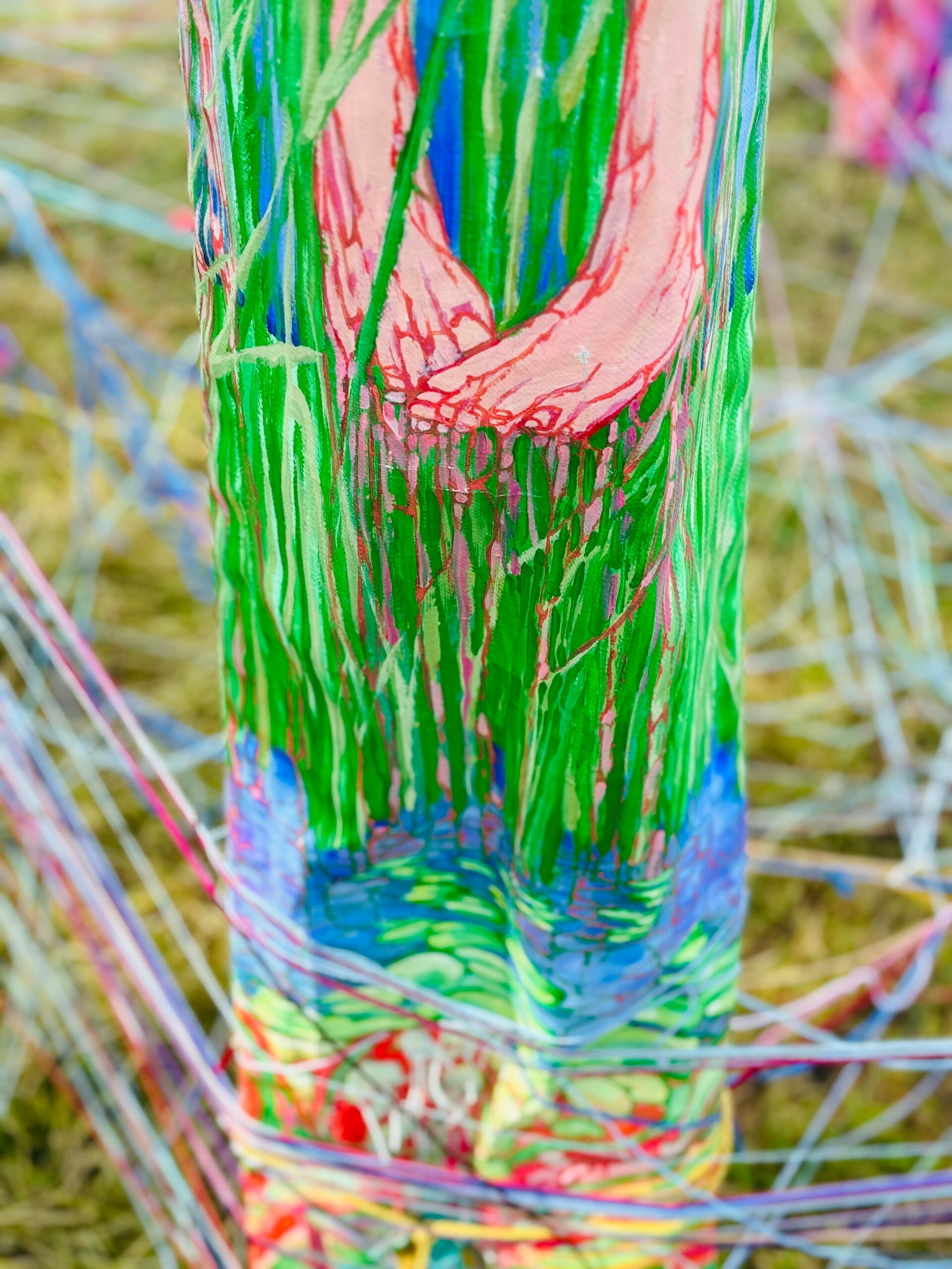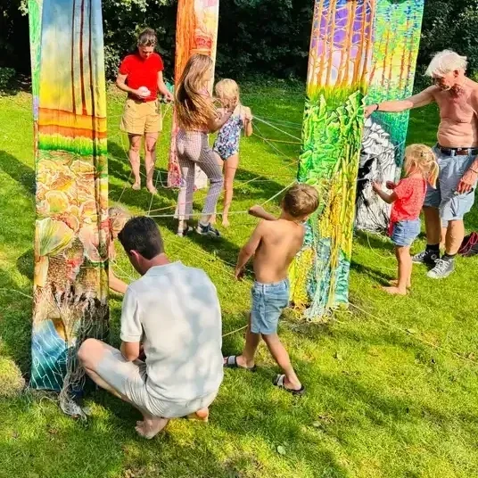 Onder. Aards. Bestaan. (2023 - 2024) Landschapskunst van linnen doeken beschilderd met algenverf, gecombineerd met geweven delen met wol en katoen, bevestigd aan bamboestokken. Een interactief project over onze verwevenheid met de wereld onder onze voeten. Een zomer lang reisde dit kunstwerk langs diverse locaties en evenementen en staat nu in Sellingen opgesteld om het proces van vergaan zijn werking te laten doen. Illustraties horen bij het verwonderboekje, dat uitgegeven werd bij het project.